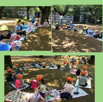 ジャングル探検の後は、待ちに待ったお弁当。たくさんの木が、みんなに日陰をつくってくれたので、涼しい中で気持ち良く、楽しく食べることができました。お外でみんなで食べるお弁当は格別です♪